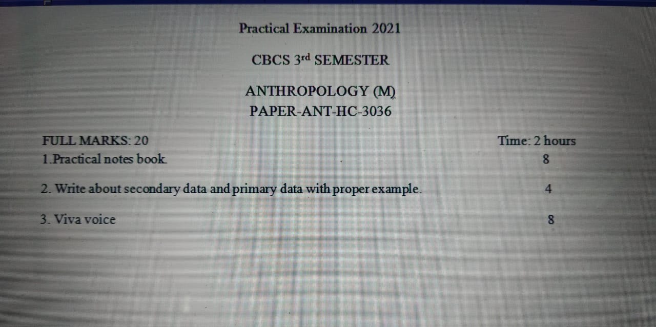 | TDC 3RD AND 4TH SEM ARTS | Anthropology (major) | Practical exam | View | |